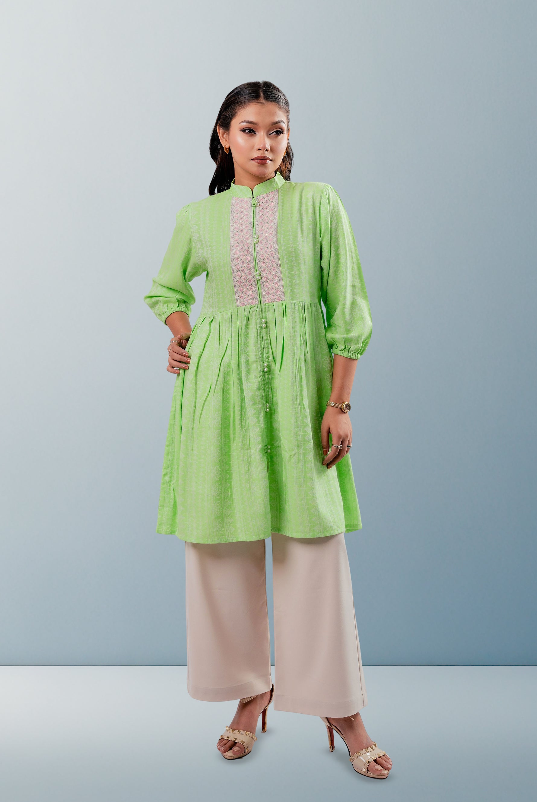 This Women's Kurti features premium Jacquard Cotton Fabric with detailed Computer Embroidery, offering both elegance and comfort for everyday wear.